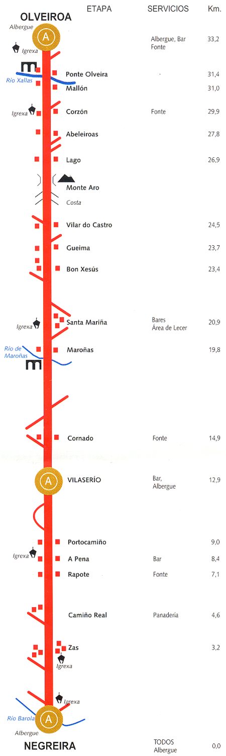 MAPA DESCRIPTIVO DE LA ETAPA 2 DEL CAMINO DE FISTERRA-MUXÍA DESDE NEGREIRA-OLVEIROA. MAPA CON INFORMACIÓN DE LOS SERVICIOS Y PUNTOS DE INTERES POR KM
