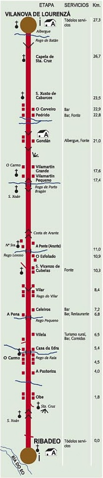 MAPA DESCRIPTIVO DE LA ETAPA 1.1 DEL CAMINO DEL NORTE DESDE RIBADEO - VILANOVA DE LOURENZÁ CON INFORMACIÓN DE LOS SERVICIOS Y PUNTOS DE INTERES POR KM