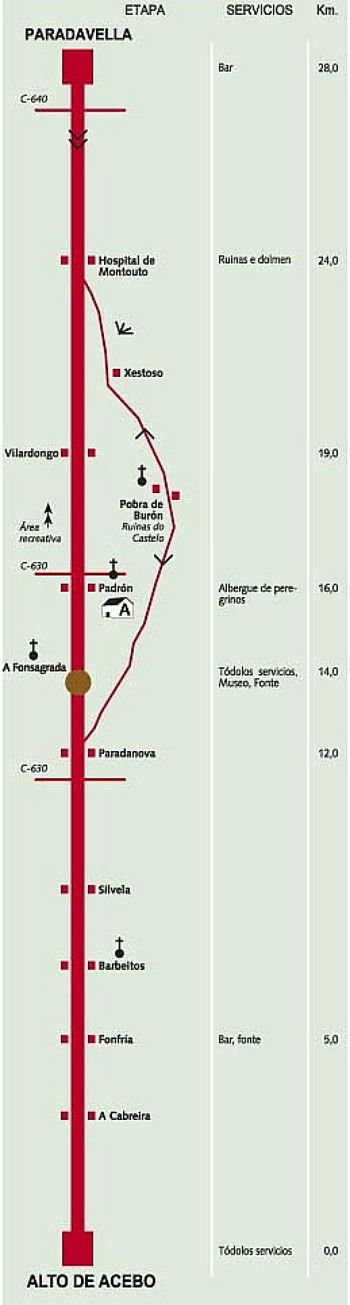 MAPA DESCRIPTIVO DE LA ETAPA 1 DEL CAMINO PRIMITIVO DESDE ALTO DO ACEBO-PARADAVELLA. MAPA CON INFORMACIÓN DE LOS SERVICIOS Y PUNTOS DE INTERES POR KM