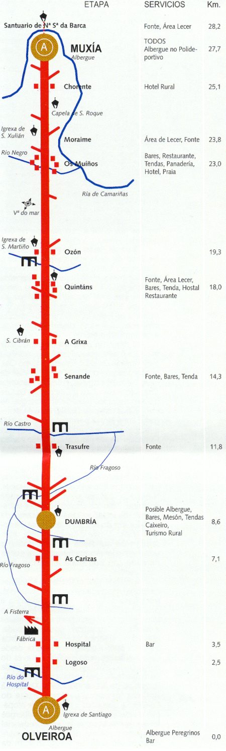 MAPA DESCRIPTIVO DE LA ETAPA 3 DEL CAMINO DE FISTERRA-MUXÍA DESDE OLVEIROA-MUXÍA. MAPA CON INFORMACIÓN DE LOS SERVICIOS Y PUNTOS DE INTERES POR KM