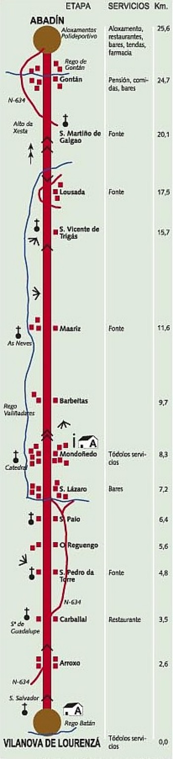 MAPA DESCRIPTIVO DE LA ETAPA 2 DEL CAMINO DEL NORTE DESDE VILANOVA DE LOURENZÁ - ABADÍN. MAPA CON INFORMACIÓN DE LOS SERVICIOS Y PUNTOS DE INTERES POR KM