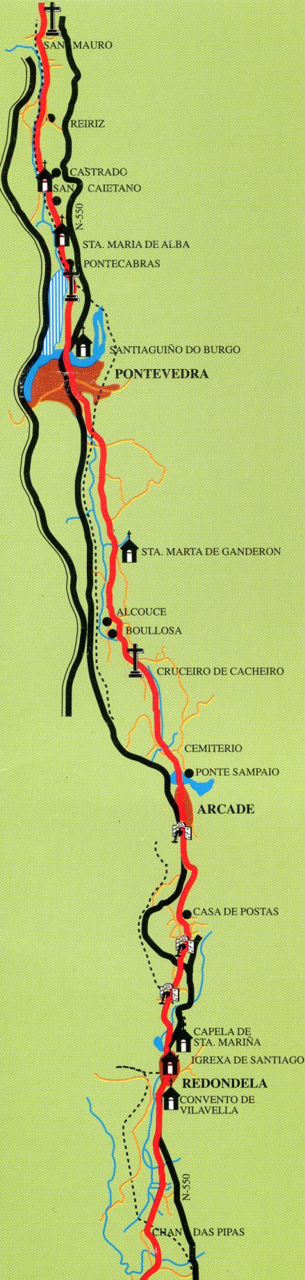 MAPA DESCRIPTIVO DE LA ETAPA 3 DEL CAMINO DE PORTUGUÉS DESDE REDONDELA - PONTEVEDRA. MAPA CON INFORMACIÓN DE LOS SERVICIOS Y PUNTOS DE INTERES POR KM